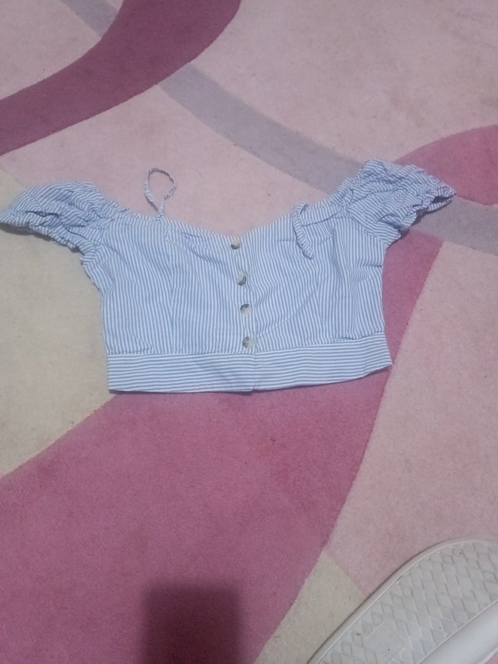 Düğmeli ön kısmı, kısa kollu ve tekne yaka detaylı, pamuklu mavi çizgili mini kadın bluz. Rahat ve şık gündelik kullanım için uygundur.