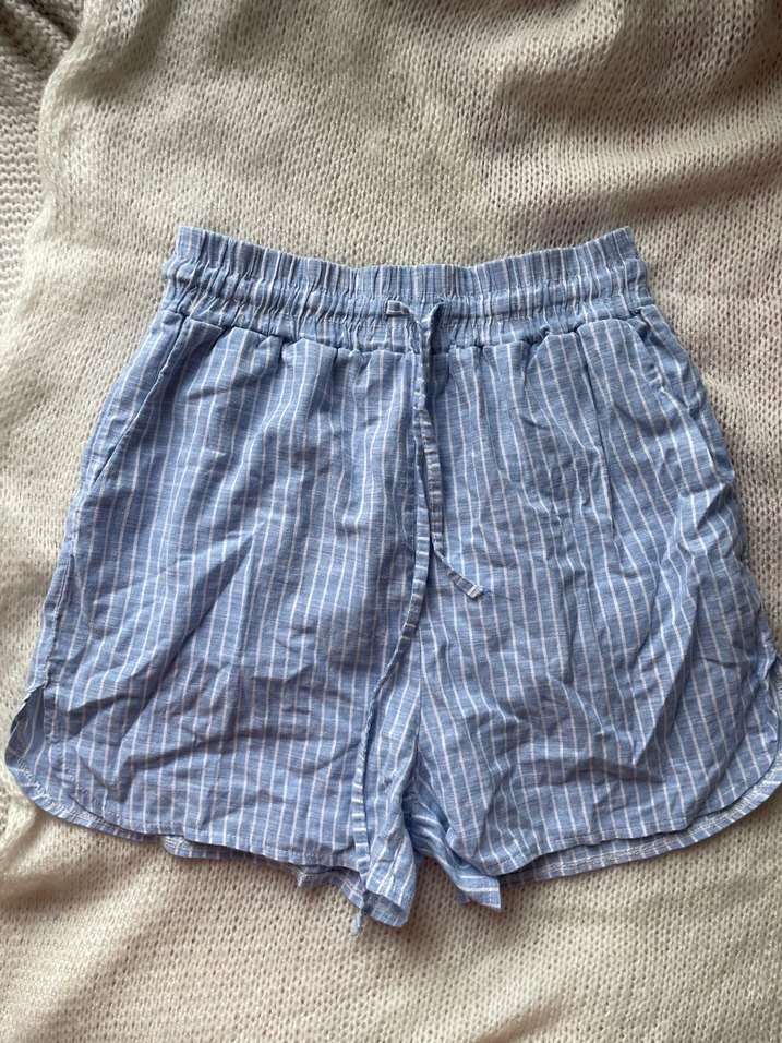 Nefes alabilen keten kumaştan, beyaz çizgili pastel mavi renkli, bol kesim mini şort. Pilili detaylar ve bağcıklı elastik bel bulunur. Günlük sokak stili için uygun.