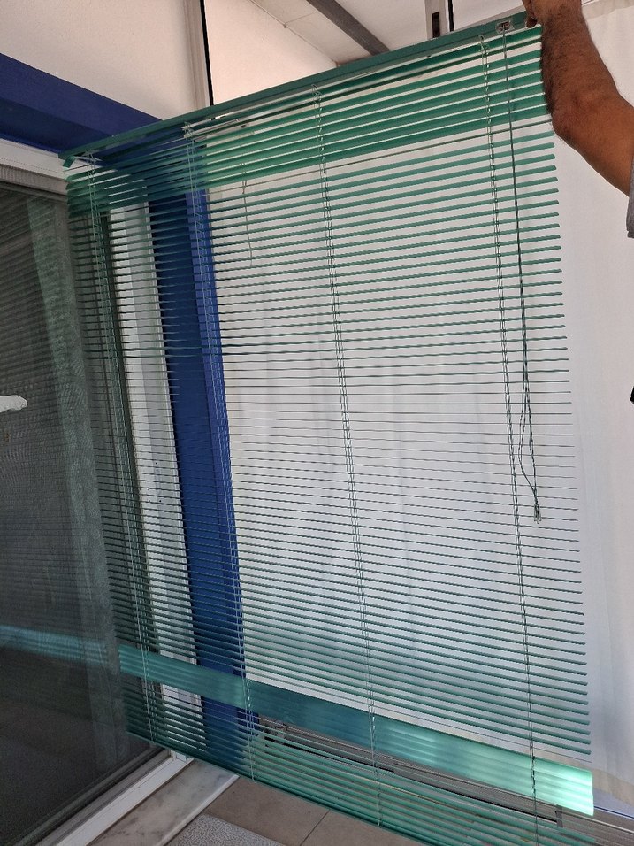 Hafif mavi çizgili, yatay çıtalı ve çekme ipli modern perde.