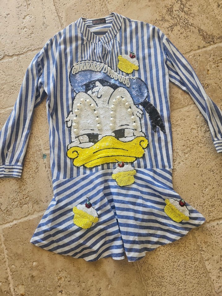 Uzun kollu, yakalı, mavi çizgili kısa gömlek. Nakışlı Donald Duck deseni ve düğmeli. Rahat, bol kesim.