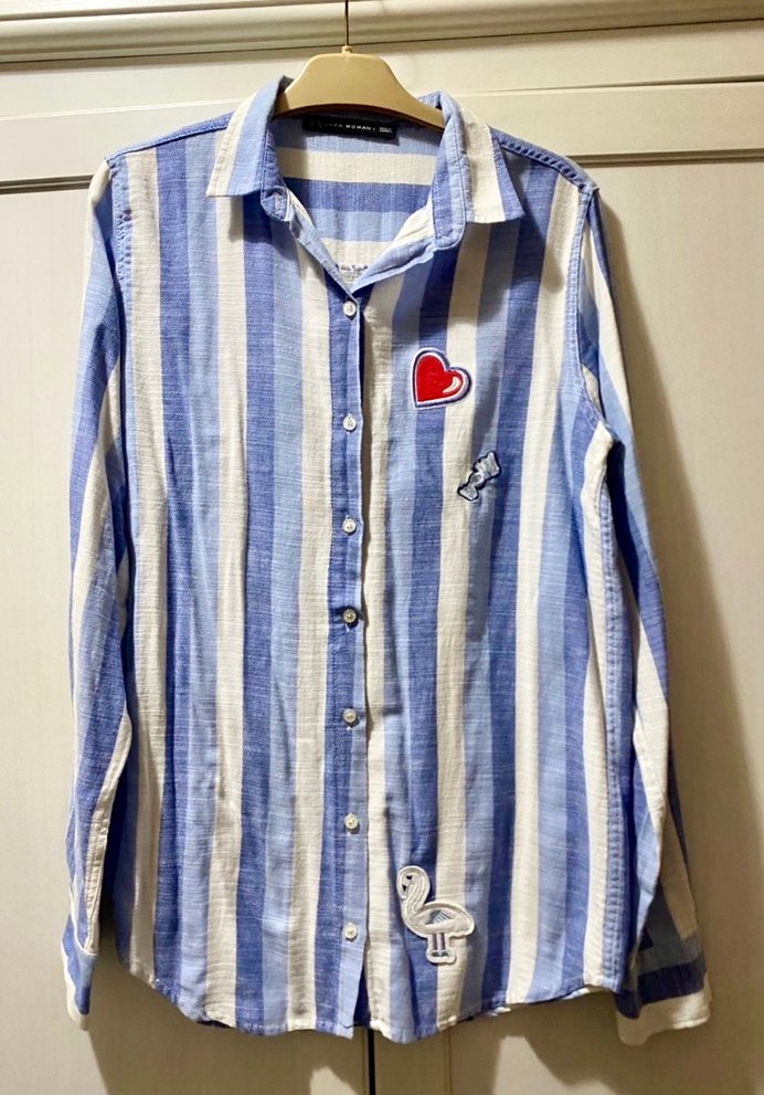 Pastel mavi çizgili denim gömlek, uzun kollu ve yakalıdır. Düğmeli ve nakışlı detayları ile günlük kullanıma uygundur.