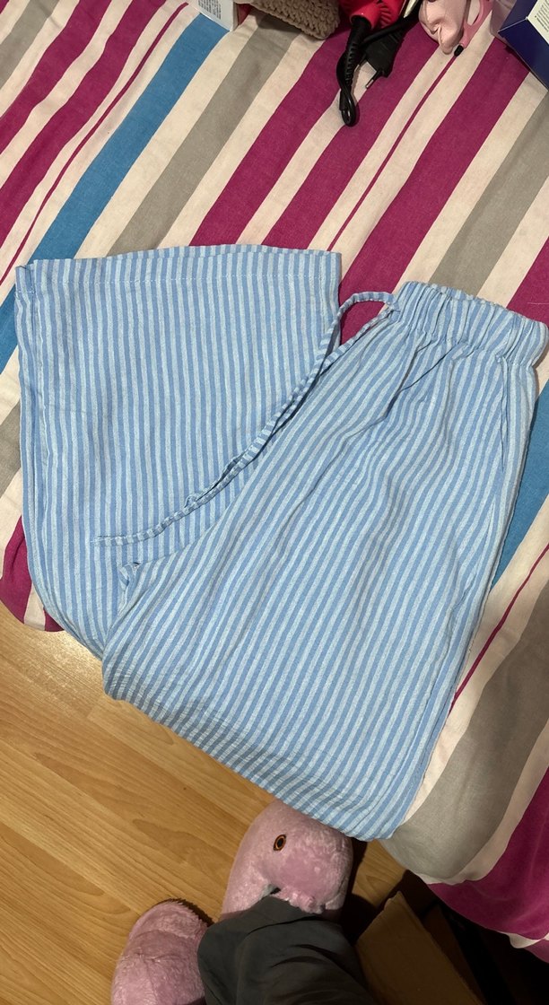 Yumuşak pamuklu kumaştan, mavi çizgili bol kesim pilili midi pantolon. Bohem tarzda, günlük kullanıma uygun rahat model.