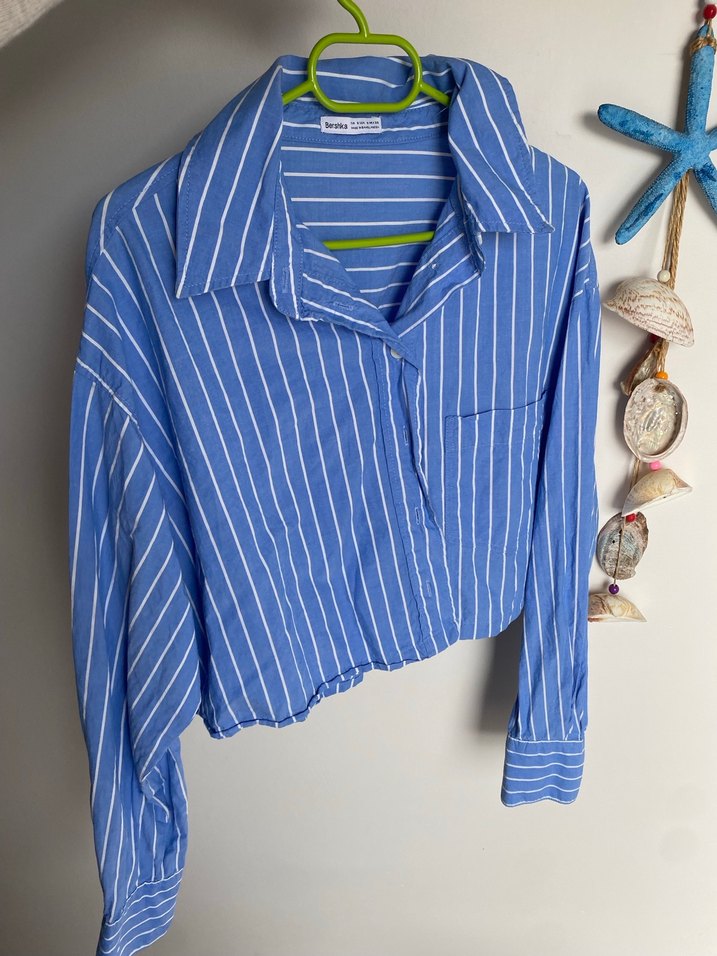 Pamuklu, mavi çizgili, kısa kesim ve bol kesim kadın gömleği. Uzun kollu, yakalı ve düğmeli tasarımıyla günlük sokak stiline uygun.