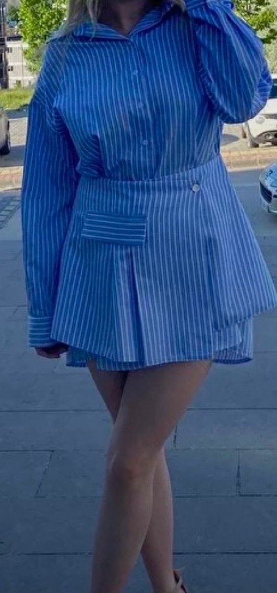 Mavi çizgili pamuklu elbise, pilili detaylı ve yakalı, günlük rahat kullanım için uygun.