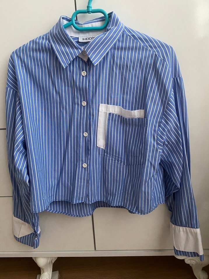 Pamuklu, uzun kollu kadın gömlek, yakalı ve düğmeli. Pastel mavi çizgili, rahat kesim ve cep ile manşet detaylı, günlük sokak tarzı için uygun.