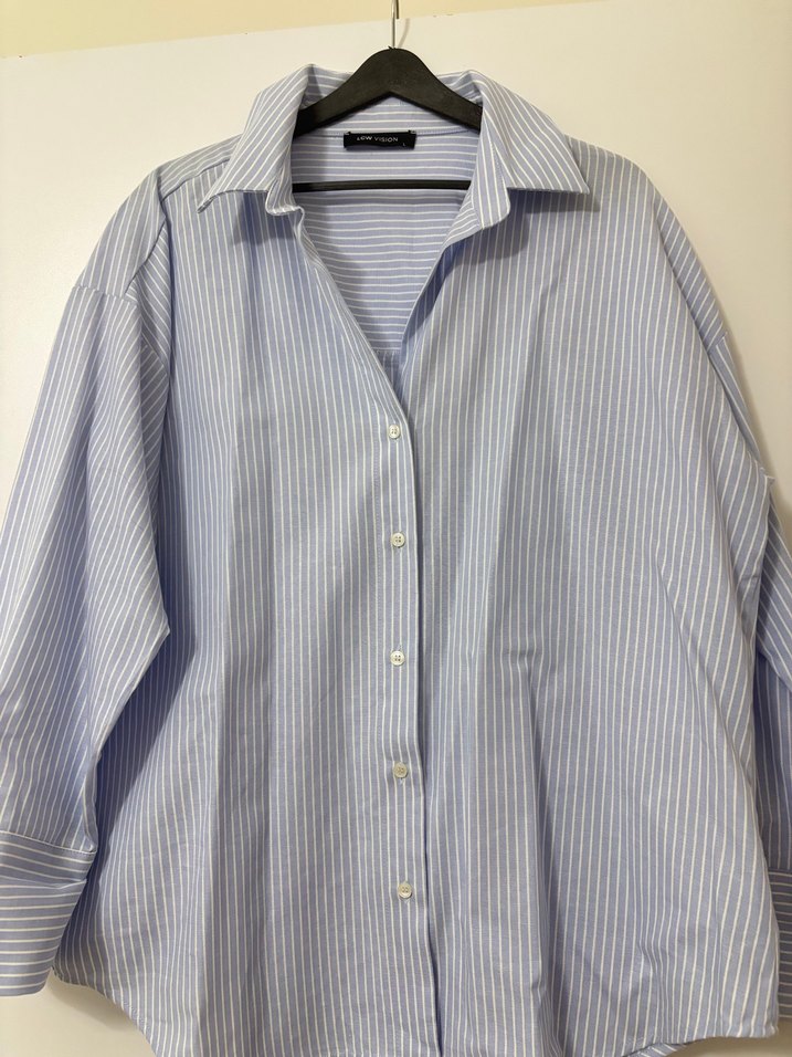 Mavi ve gri çizgili, pamuklu kumaştan yapılmış, düğmeli ve yakalı, uzun kollu kadın gömleği. Ofis ve günlük kullanıma uygun, rahat kesim.