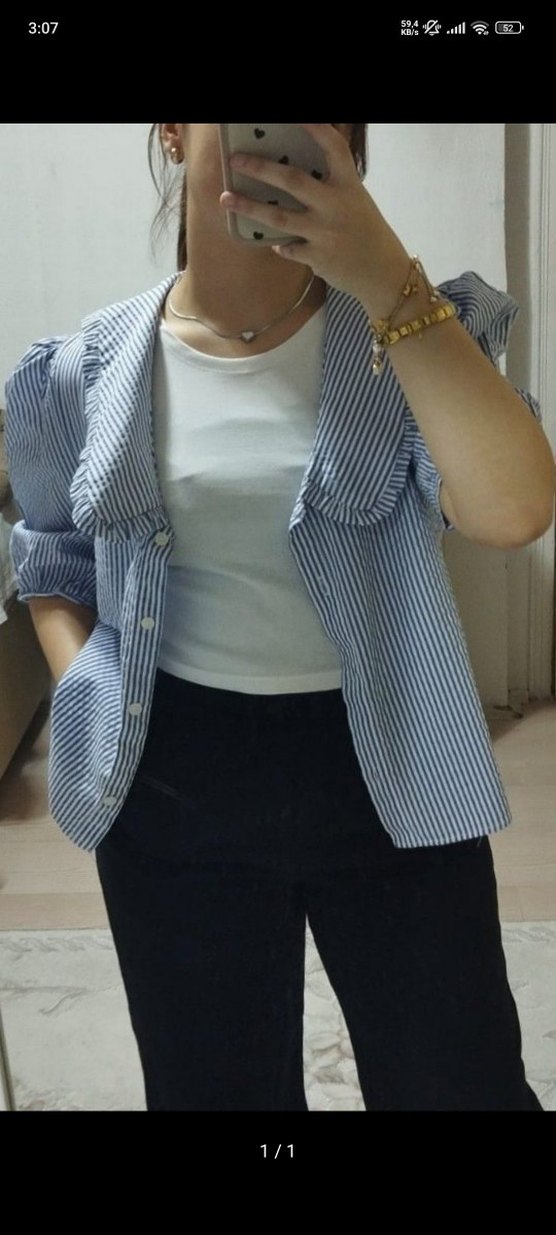 Hafif mavi çizgili pamuklu, bol kesim kısa kollu, yakalı ve düğmeli kadın gömlek, günlük sokak tarzı için uygundur.
