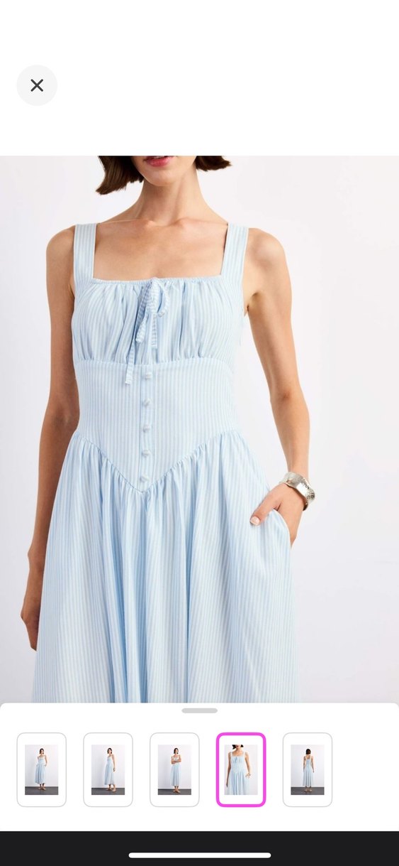 Mavi çizgili pamuklu kumaştan yapılmış, uzun ve fitted kesim elbise. Kayık yaka, askılı ve pile detaylıdır. Modern klasik ve Paris tarzını yansıtır.