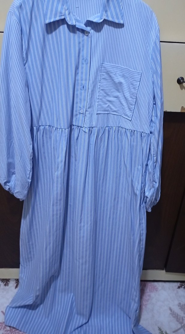Mavi renkli pamuklu uzun elbise, bol kesim, pile detaylı, uzun kollu, yakalı ve çizgili desene sahiptir.