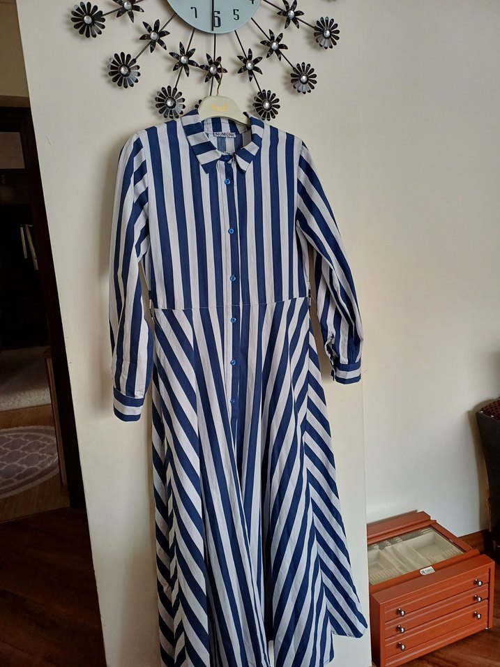 Mavi çizgili, yakalı ve uzun kollu pamuklu uzun elbise. Rahat kesim ve pileli tasarıma sahip, bohem tarzı yansıtıyor. Günlük kullanım için uygundur.