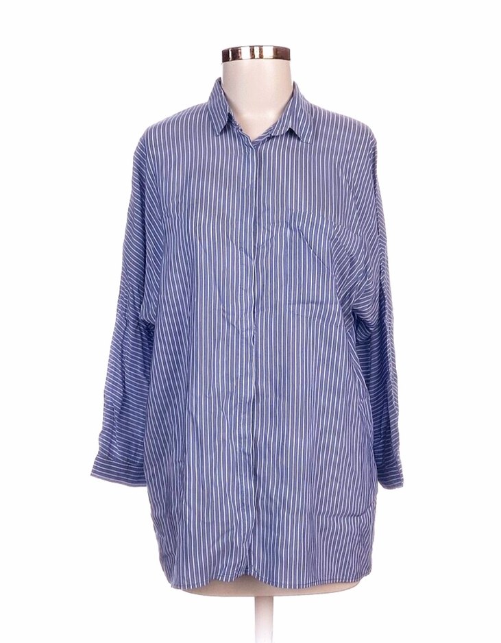 Pamuklu, mavi çizgili, uzun kollu, yakalı ve düğmeli önlü bol kesim gömlek. Günlük rahat kullanıma uygundur.sayılı kullanıldı. herhangi bir kusuru yoktur. mevsimlik viskon kumaş. en 65cm , boy 73cmdir.ayrintilar fotoğraflarda mevcut. large beden de rahatlıkla kullanılabilir. #zara #gömlek #çizgili #mango #ipekyol #koton #bershka #stradivarius #lila #mavi