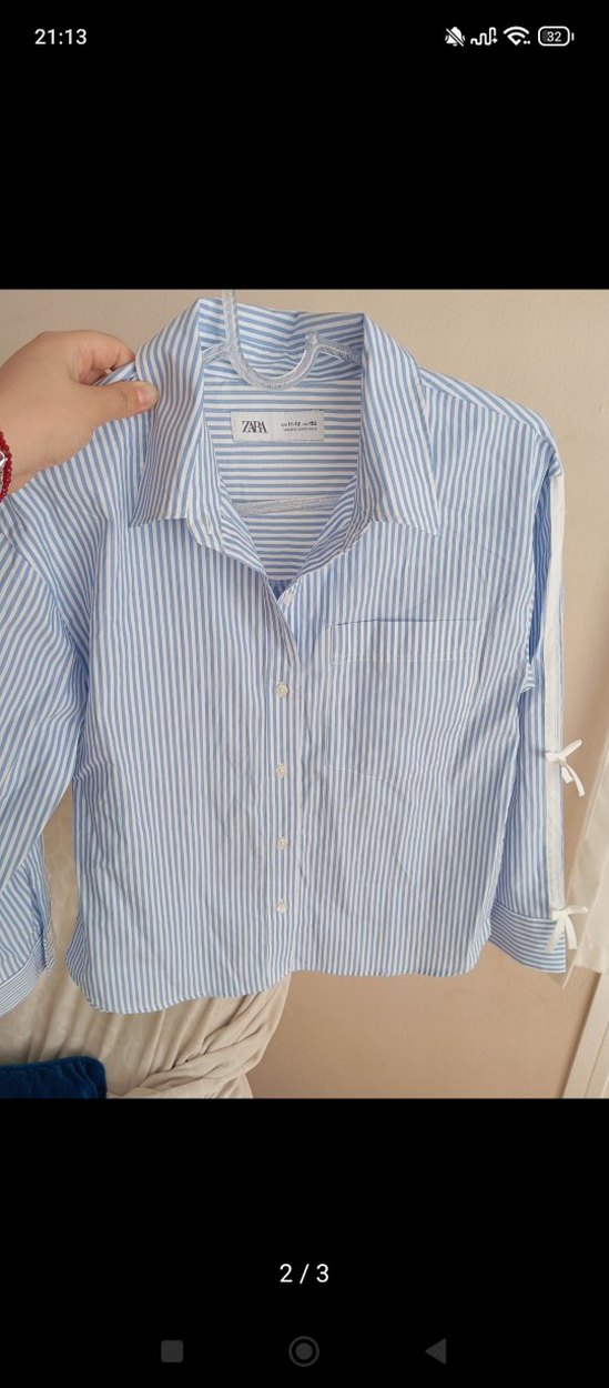 Mavi çizgili pamuklu gömlek, yakalı ve düğmeli, uzun kollu ve rahat kesimlidir, günlük kullanıma uygundur.