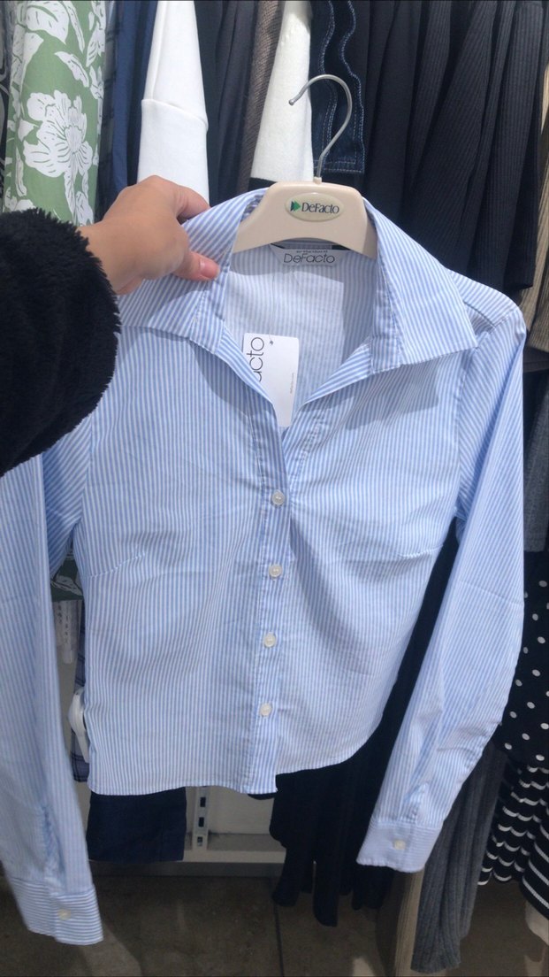 Pamuklu, uzun kollu, yakalı ve düğmeli, pastel mavi çizgili, trend sokak giyim tarzında dar kesim gömlek. Sadece 1 kez giyildi.Kilo aldığım için olmadı bir daha