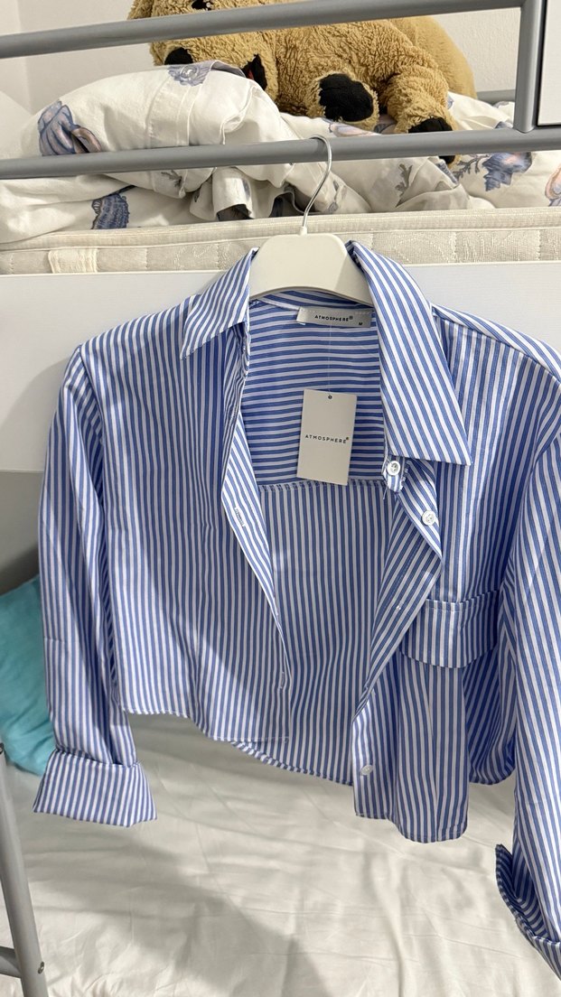 Kadınlar için mavi çizgili pamuklu gömlek, yakalı ve düğmeli önlüdür. Uzun kollu ve normal boyda, günlük kullanım için uygundur.