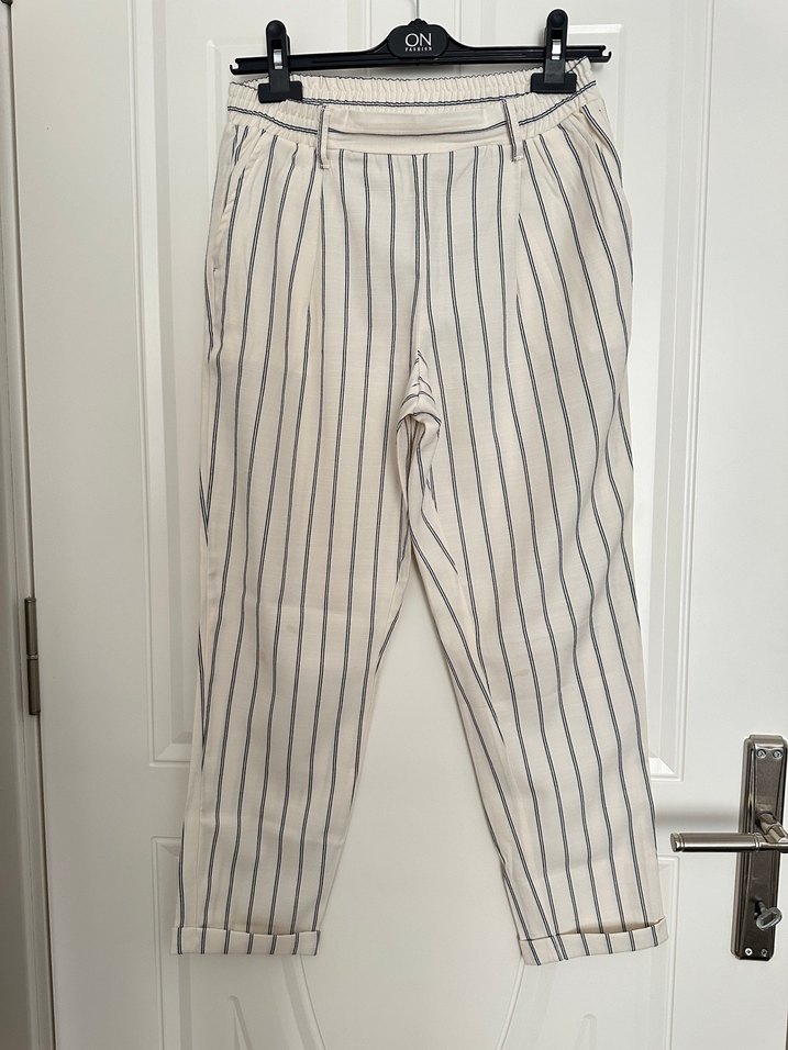 Mavi ve beyaz renklerde, pamuklu kumaştan yapılmış, çizgili ve pileli detaylı, midi boy ve regular fit kadın pantolon. Günlük kullanıma uygun rahat bir tasarım.