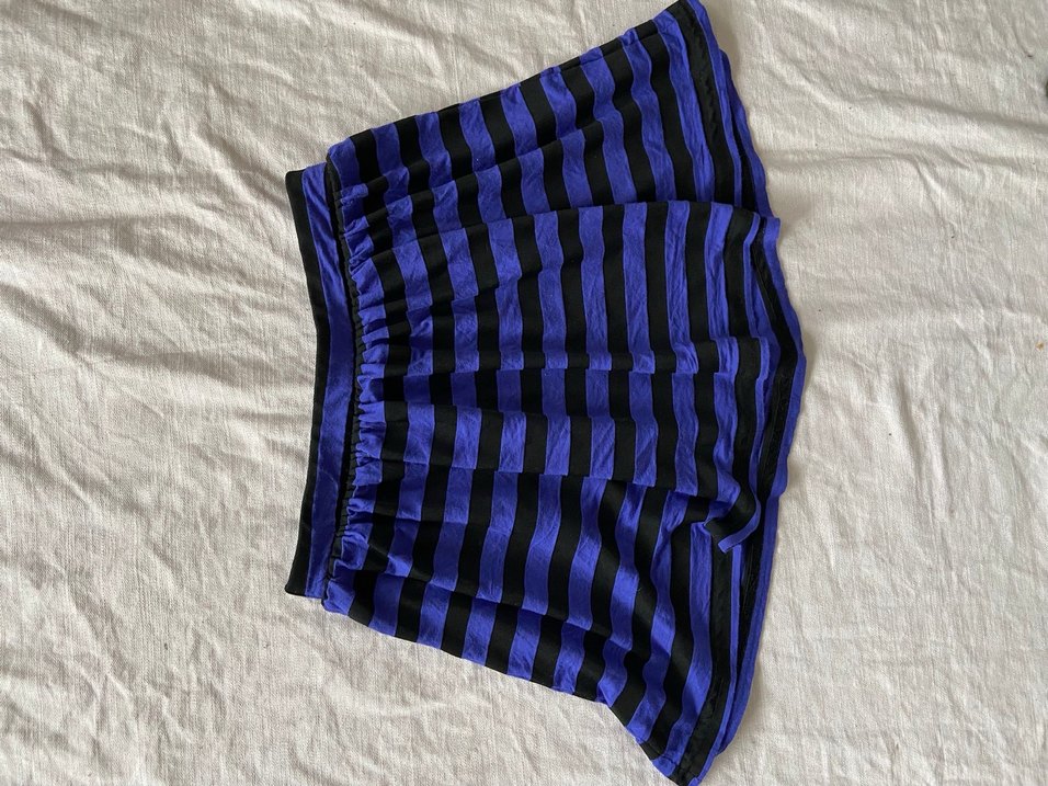 Koyu mavi ve siyah çizgili, pilili, vücuda oturan hamile midi eteği. Sentetik kumaştan üretilmiş, günlük kullanıma uygun gotik tarzda.
