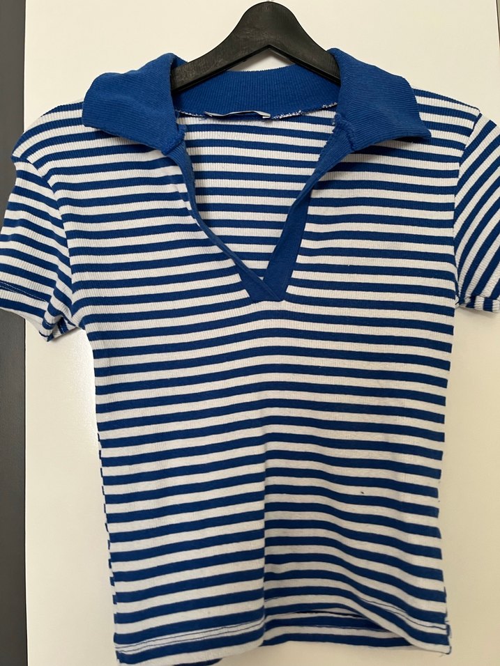 Yakalı, kısa kollu, pamuklu, parlak mavi beyaz çizgili ve düğmeli, dar kesim polo tişört.