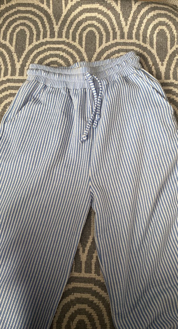 Mavi ve gri çizgili, keten kumaştan, rahat kesim ve pile detaylı midi boy pantolon. Belde bağcıklı, günlük sokak stili için uygun.