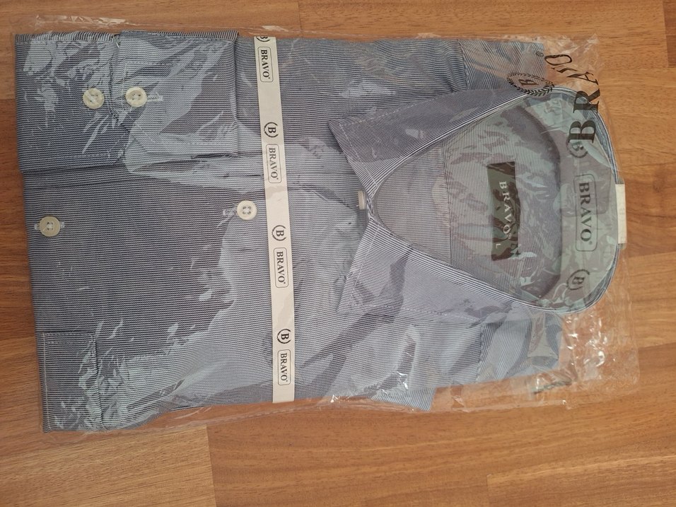 Mavi çizgili ve yakalı. Sentetik kumaş. Regular fit. BRAVO marka. L bedendir.
