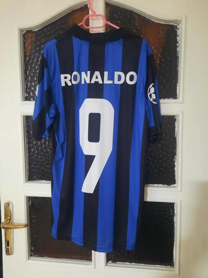 Mavi ve siyah çizgili, kısa kollu, düğmeli erkek forma. Sırtında 'RONALDO' ve 9 numarası baskılıdır, sportif tarz için uygundur. ⚽