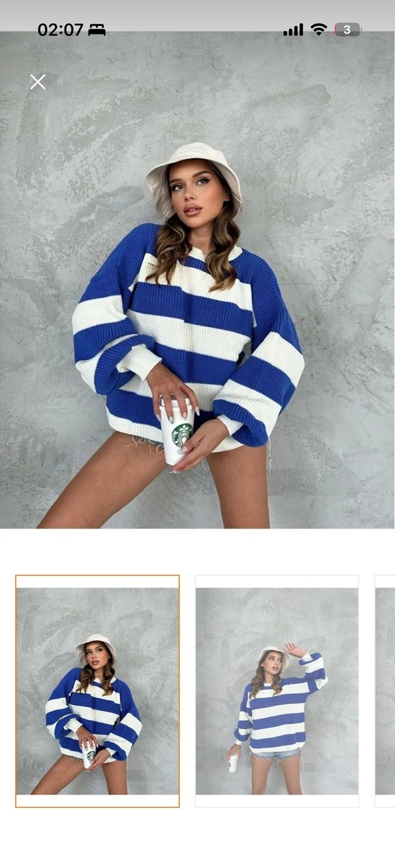 Bu rahat kadın kazağı, salaş kesim ve uzun kollu, yuvarlak yakalıdır. Kısa boyda ve mavi-beyaz çizgili örgü deseniyle sokak stiline uygundur.