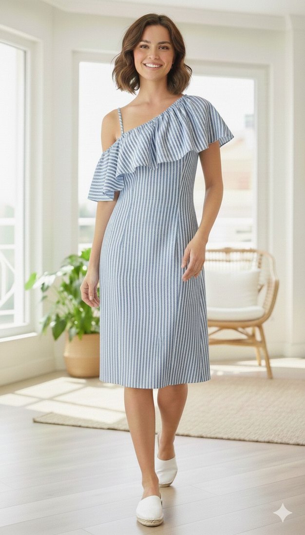 Mavi çizgili diz üstü elbise, straplez yaka, drapeli fırfır ve ince askısı bağlamalıdır.Etiketli sıfır ürün.