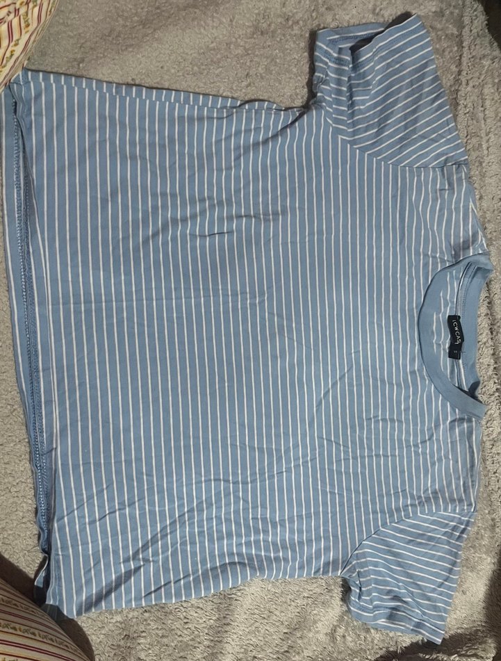 Mavi ve gri çizgili, kısa kollu, bol kesim kadın tişört. Yuvarlak yaka , günlük rahat sokak stiline uygun sentetik kumaş.