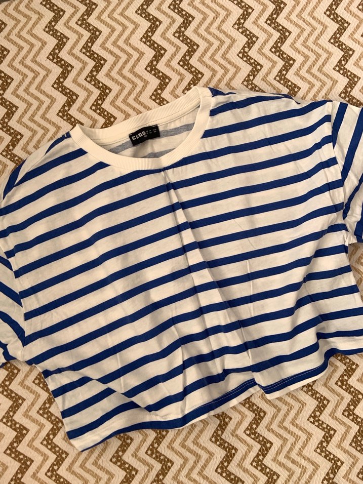 xs beden crop tisört tam göbek hizasında bitiyor asırı kısa da degil 1-2 defa giydim Pamuk kumaştan, kısa kollu ve yuvarlak yakalı.mavi çizgili ve pile detaylı, günlük kullanıma uygun kısa boyda.