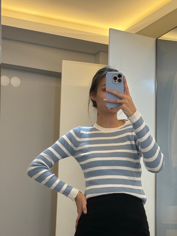 Mavi çizgili, uzun kollu, bisiklet yaka, triko kumaştan yapılmış, günlük kullanıma uygun, trend casual tarzda dar kesim kadın kazak. S beden