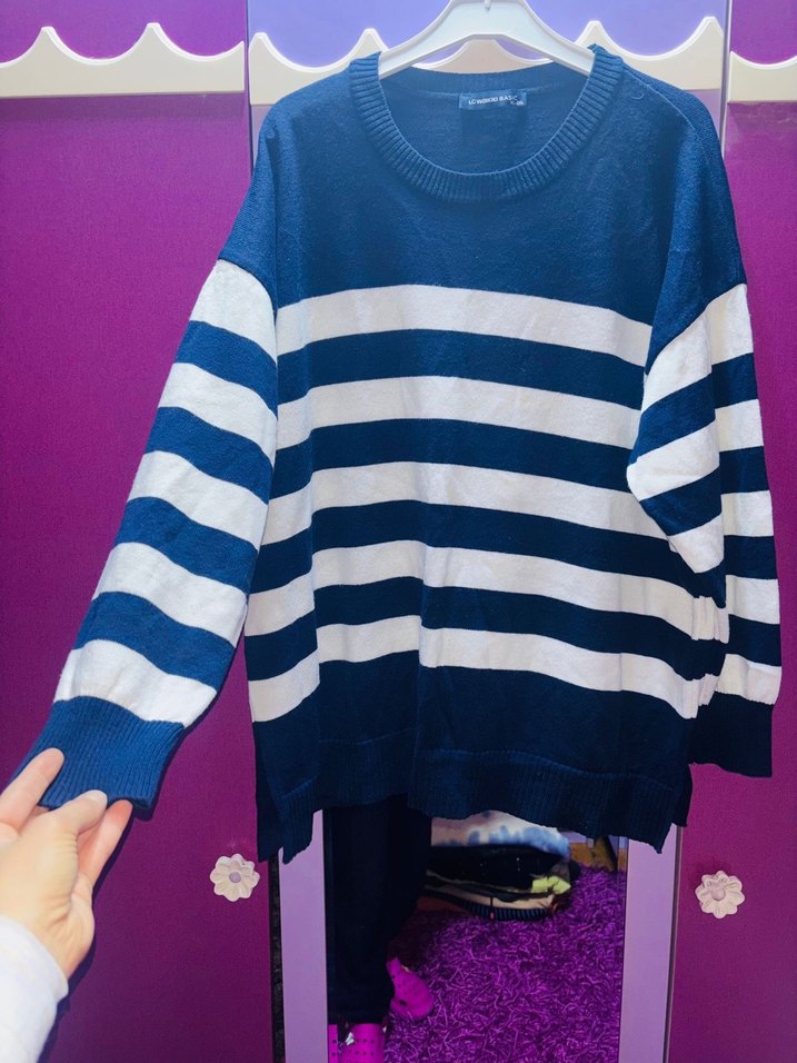 Kadınlar için triko, uzun kollu, bol kesim, crew yaka, koyu mavi ve beyaz çizgili rahat sokak stili kazak.