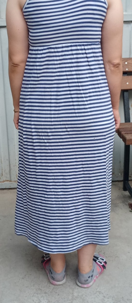 Mavi ve gri çizgili, pile detaylı bol kesim uzun hamile eteği. Sentetik kumaştan, günlük rahat kullanım için uygundur.