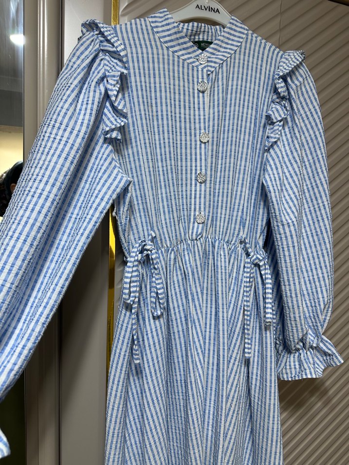 Mavi çizgili, keten kumaştan uzun elbise, yakalı ve fırfırlı detaylara sahip. Rahat kesimiyle günlük kullanıma uygundur.