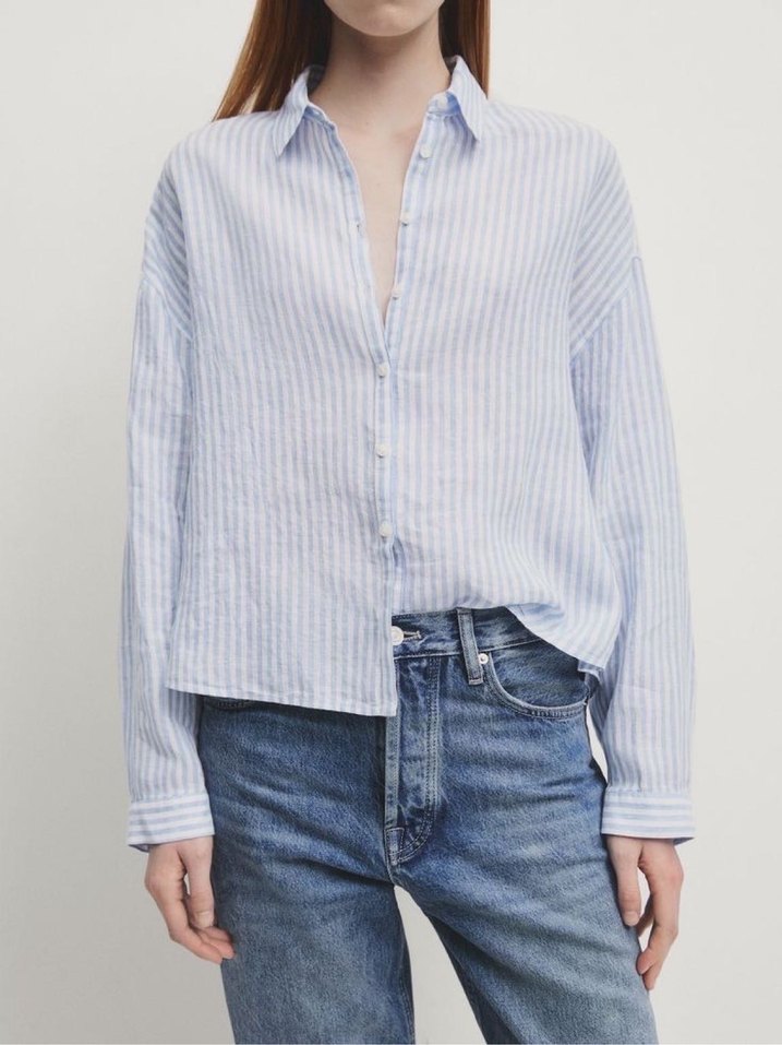 Açık mavi çizgili denim gömlek, yakalı ve düğmeli. Uzun kollu, normal kesim, günlük sokak stili için uygundur.
