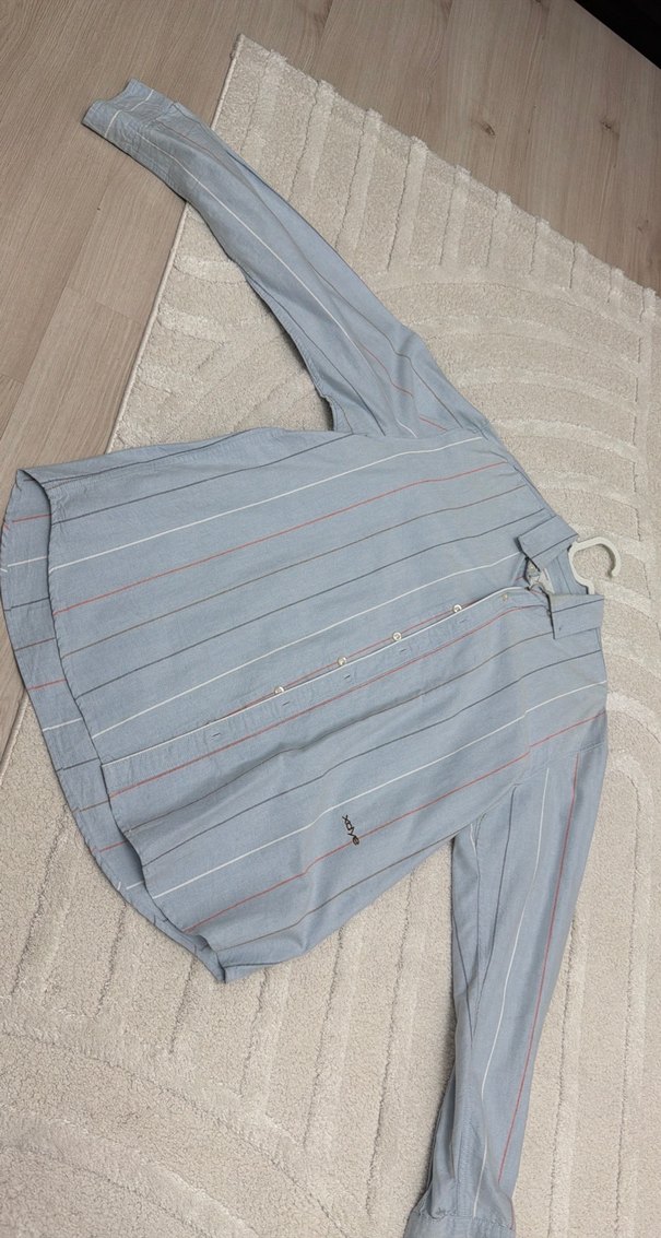 Mavi renkte, ince çizgili uzun kollu denim gömlek. Düğmeli önü ve yakası ile rahat kesimde, günlük kullanıma uygundur.