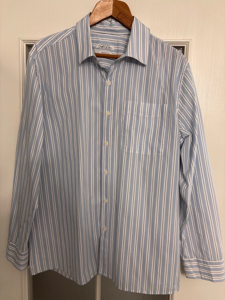 Mavi çizgili, uzun kollu erkek gömleği. Pamuk kumaştan, düğmeli ve göğüs cebine sahip, normal kesim. Ürün hiç kullanılmamıştır. Genişlik 58 cm, boy 75 cm, kol 64 cm’dir.