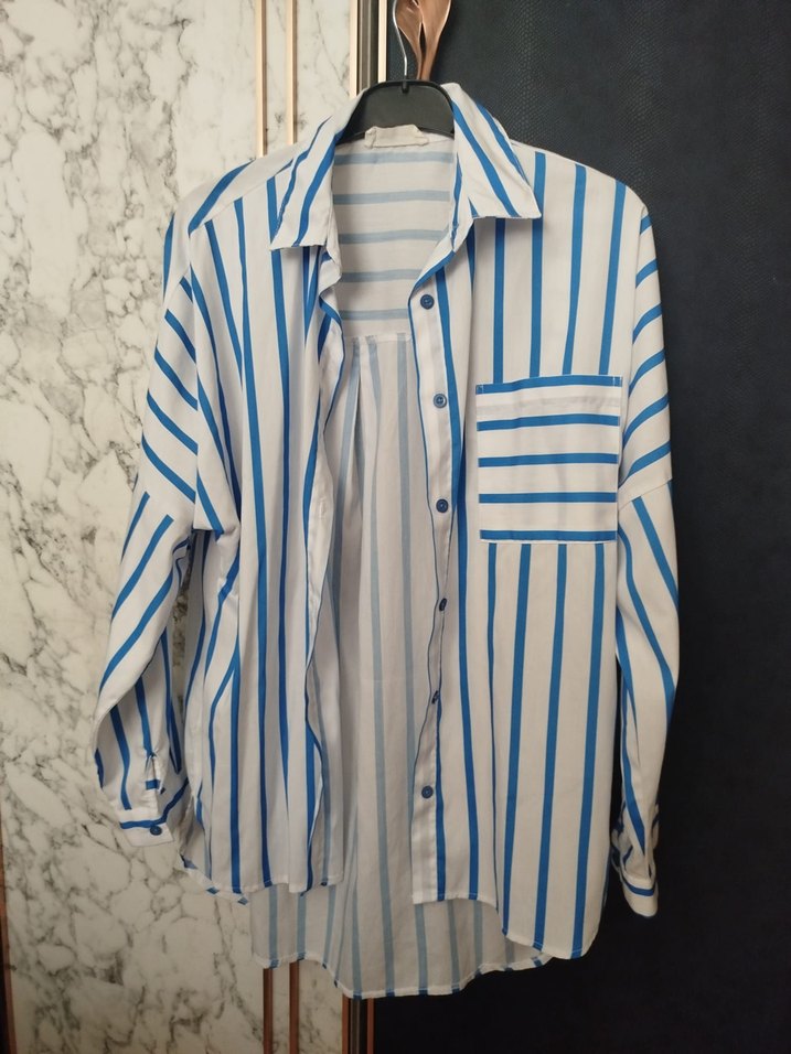 Hafif mavi çizgili, yakalı ve düğmeli uzun kollu gömlek. Nefes alabilen keten kumaştan, rahat ve bol kesim. Günlük rahat kullanıma uygun.