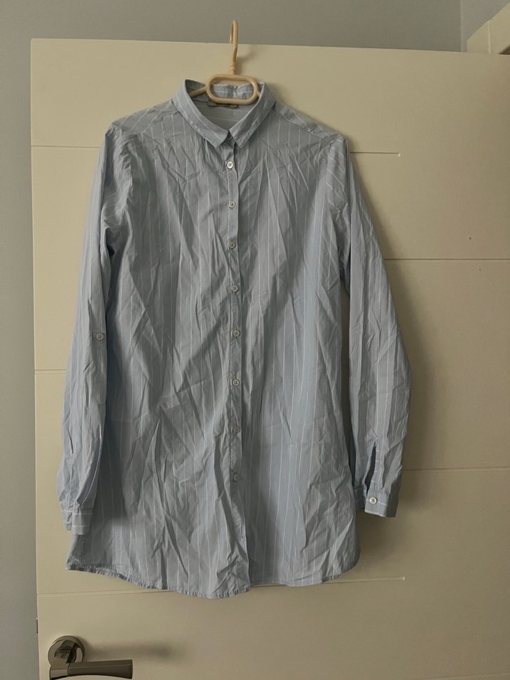 Mavi çizgili gömlek, yakalı ve düğmeli, uzun kollu, minimal ve gündelik tarz için uygundur.