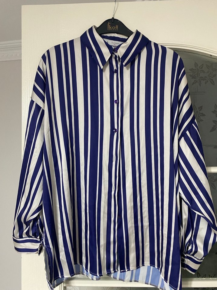 Uzun kollu, yakalı ve düğmeli kadın gömleği. Gevşek kesim, parlak mavi çizgili deseni ve sentetik kumaştan yapılmıştır. Sokak stiline uygun, Paris esintili rahat model.