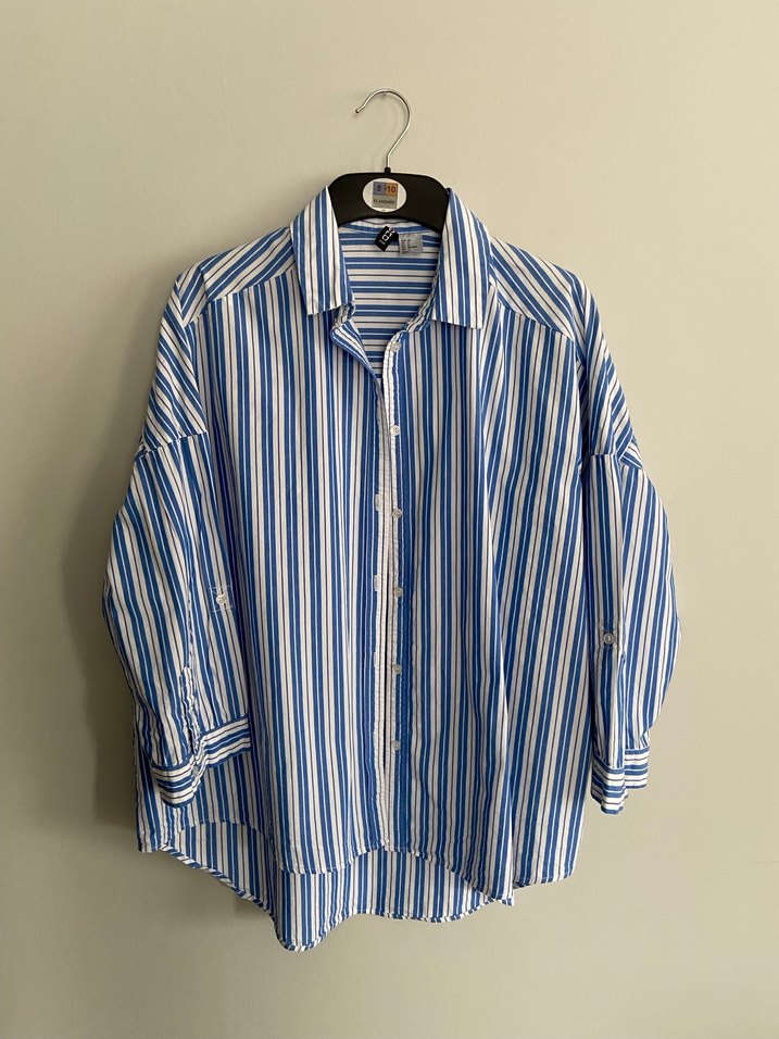 Uzun kollu, düğmeli ve yakalı mavi çizgili pamuk gömlek. Rahat kesimi ve midi boy uzunluğuyla günlük sokak stiline uygun.