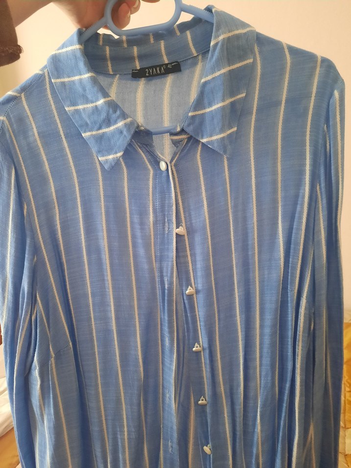 Mavi renkli, uzun kollu kadın gömlek, düğmeli ve yakalıdır. Rahat kesimi ve yumuşak keten kumaşıyla gündelik kullanıma uygundur. herhngi bir kusuru yoktur.