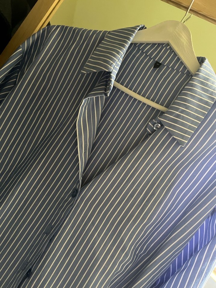 Notlu yakalı, düğmeli mavi çizgili uzun kollu kadın gömlek. Regular kesim ve uzun boy, ofis ve günlük kullanıma uygun.