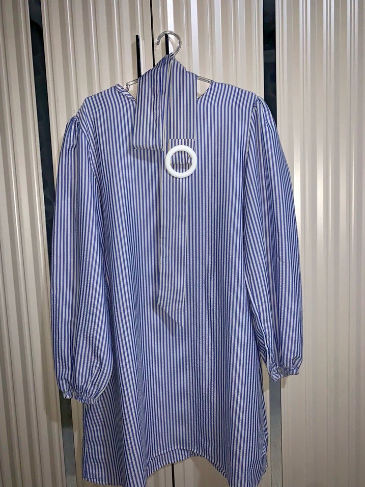Mavi ve gri çizgili, uzun kollu, yakalı ve düğmeli, bol kesim kadın gömleği. Tekstil kumaştan, günlük kullanıma uygun