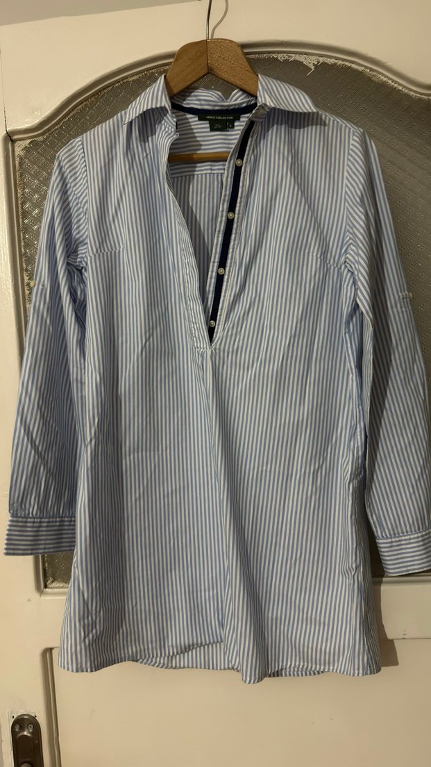 Mavi çizgili, pamuk kumaştan, uzun kollu, düğmeli ve yakalı kadın gömlek. Normal midi boyunda ve rahat kesimlidir.