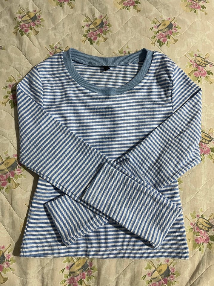 Pamuklu örgü kumaştan, mavi pastel çizgili, uzun kollu ve bisiklet yakalı kadın üstü. Trendy rahat bir tarza uygun.
