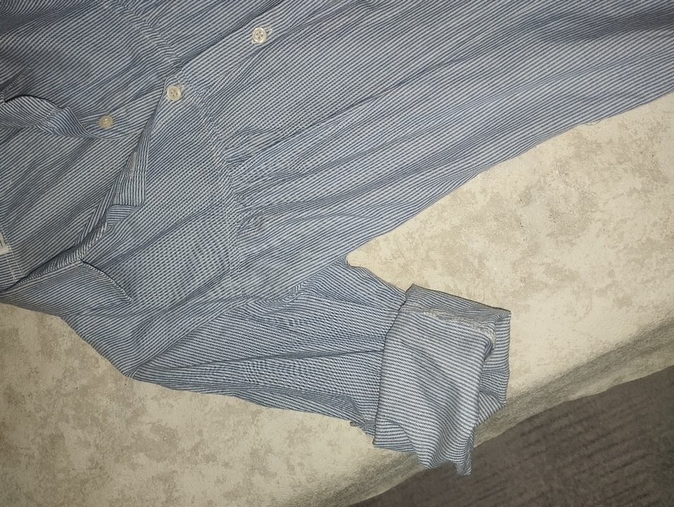Mavi keten gömlek, uzun kollu ve çıtçıtlıdır. Notlu yaka ve normal boyda, rahat kesimiyle gündelik sokak stiline uygundur.