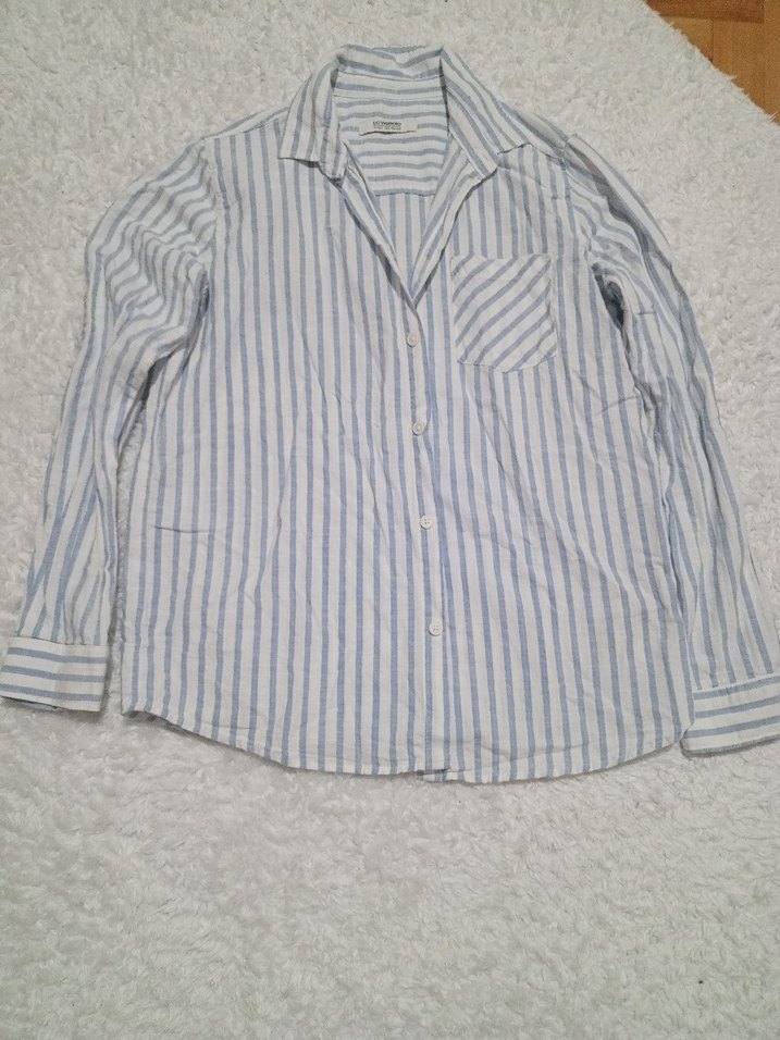 Mavi pastel çizgili gömlek, uzun kollu ve yakalıdır. Yumuşak keten kumaştan üretilmiş, düğmeli ve bol kesimdir. Günlük rahat sokak stili için uygundur.