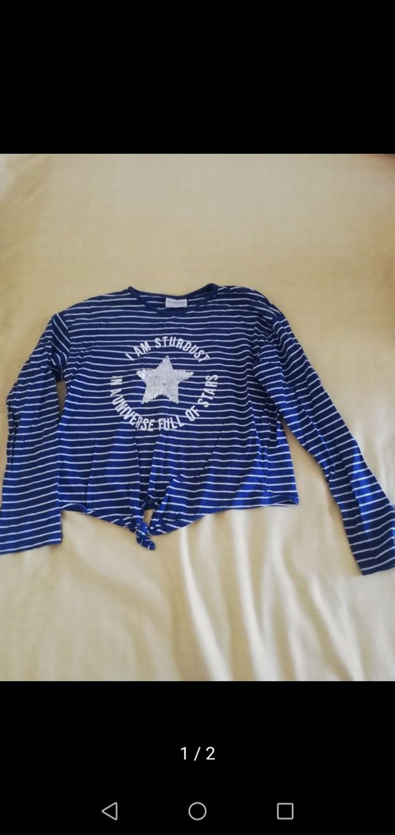 Mavi çizgili, uzun kollu, yuvarlak yakalı kız tişörtü. Yumuşak örme kumaştan, bol kesim. Yıldız ve "I AM STURDO" yazılı, uç kısmı bağcıklı. ⭐