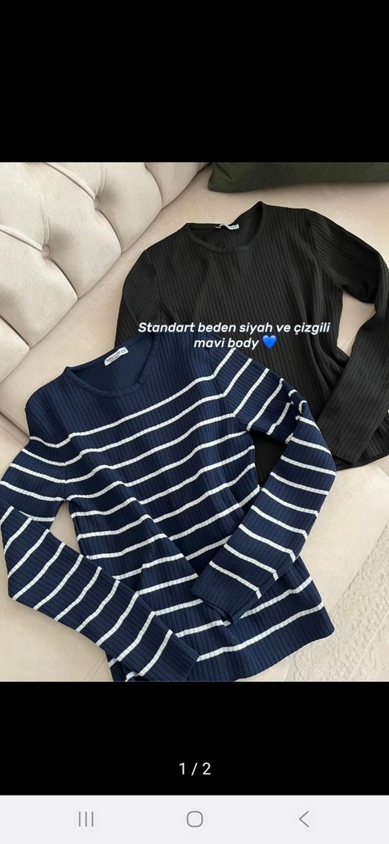 Mavi renkli, çizgili örgü pamuklu kadın kazak. Uzun kollu, bisiklet yaka ve normal kesimdir. Standart beden, günlük kullanıma uygun.