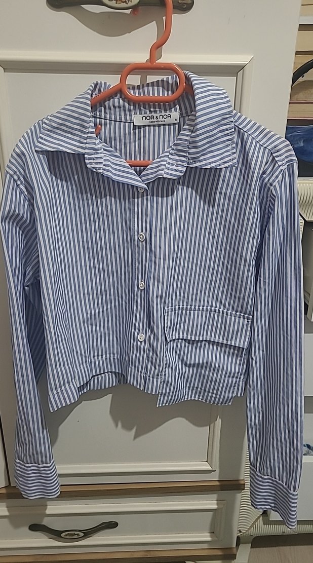 Mavi çizgili, uzun kollu, yakalı ve düğmeli pamuklu gömlek. Rahat, bol kesim ve normal boyda, günlük rahat kullanıma uygun.