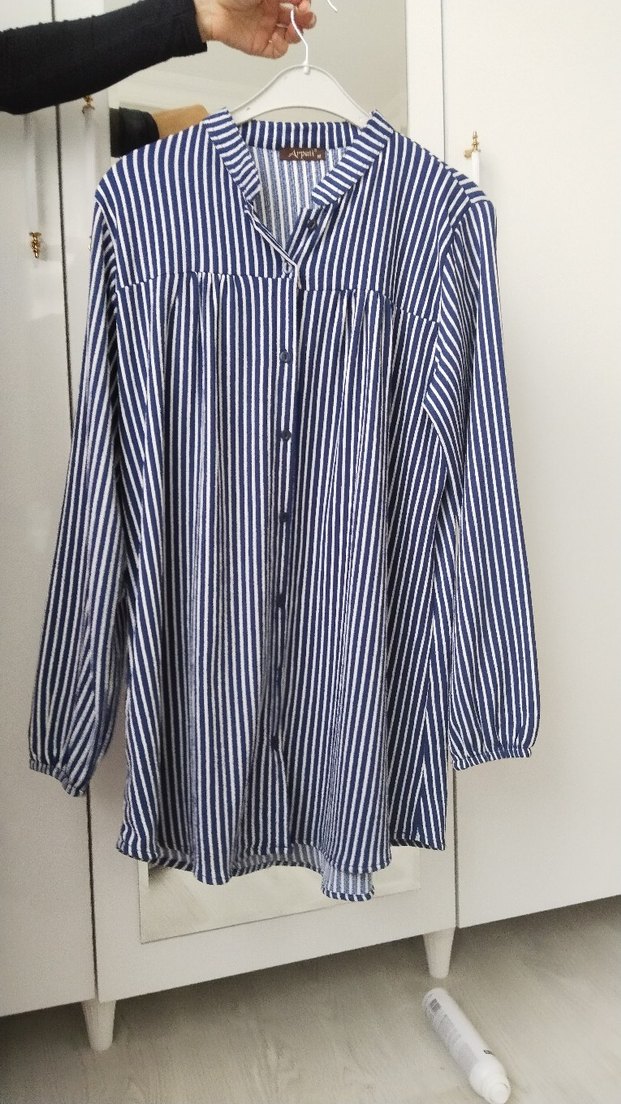 Pamuklu kumaştan, uzun kollu ve yüksek yakalı, bol kesim gömlek. Koyu mavi çizgili ve pileli detaylara sahip, rahat ve şık.